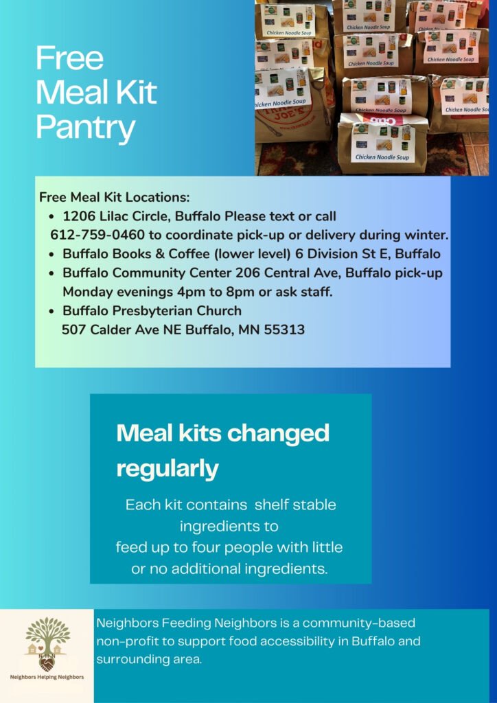 The community based group “Neighbors feeding Neighbors” has created free meal kits. Tap on read more to see the flyer which has more information. These kits are NOT available at the food shelf.